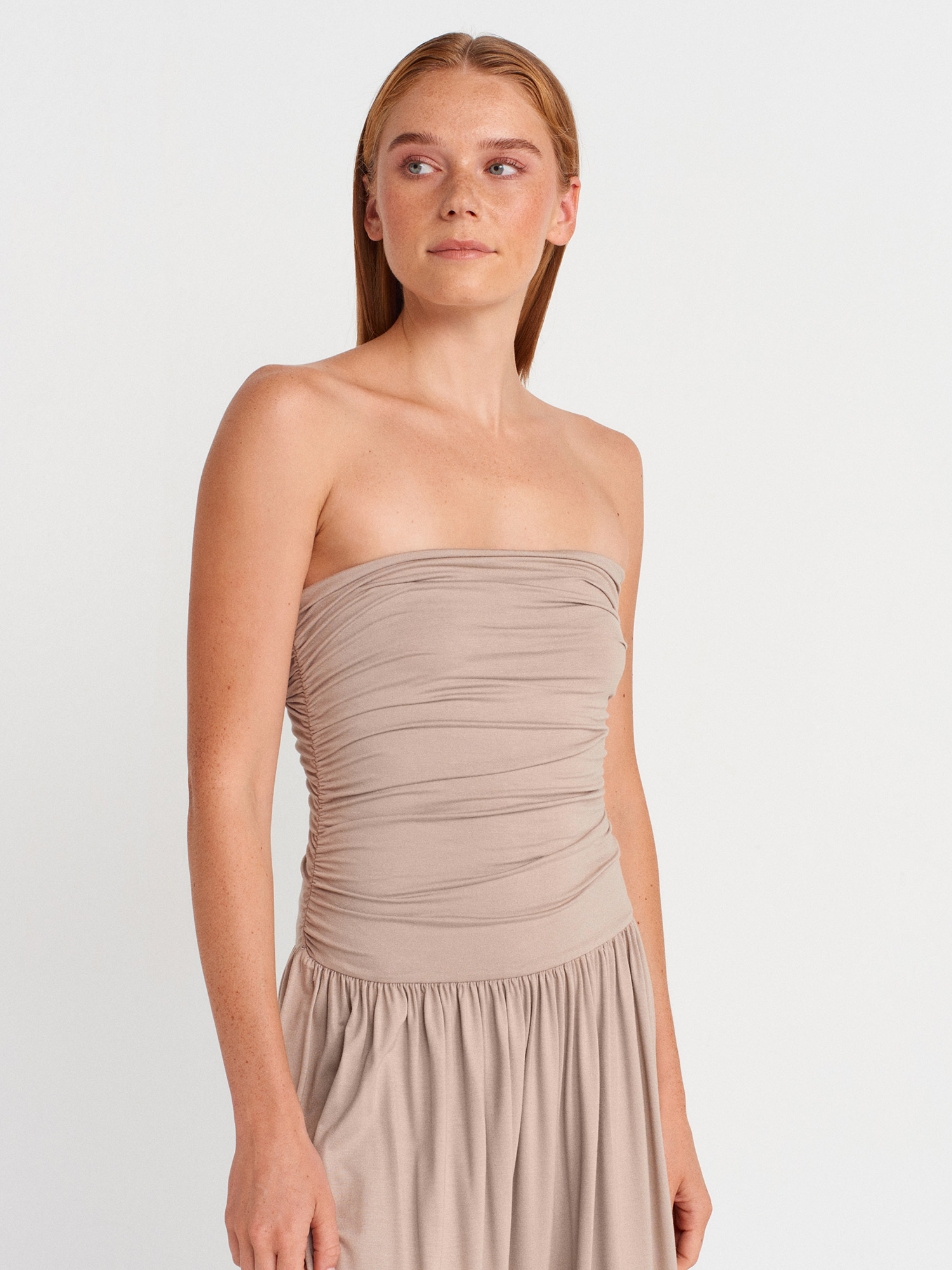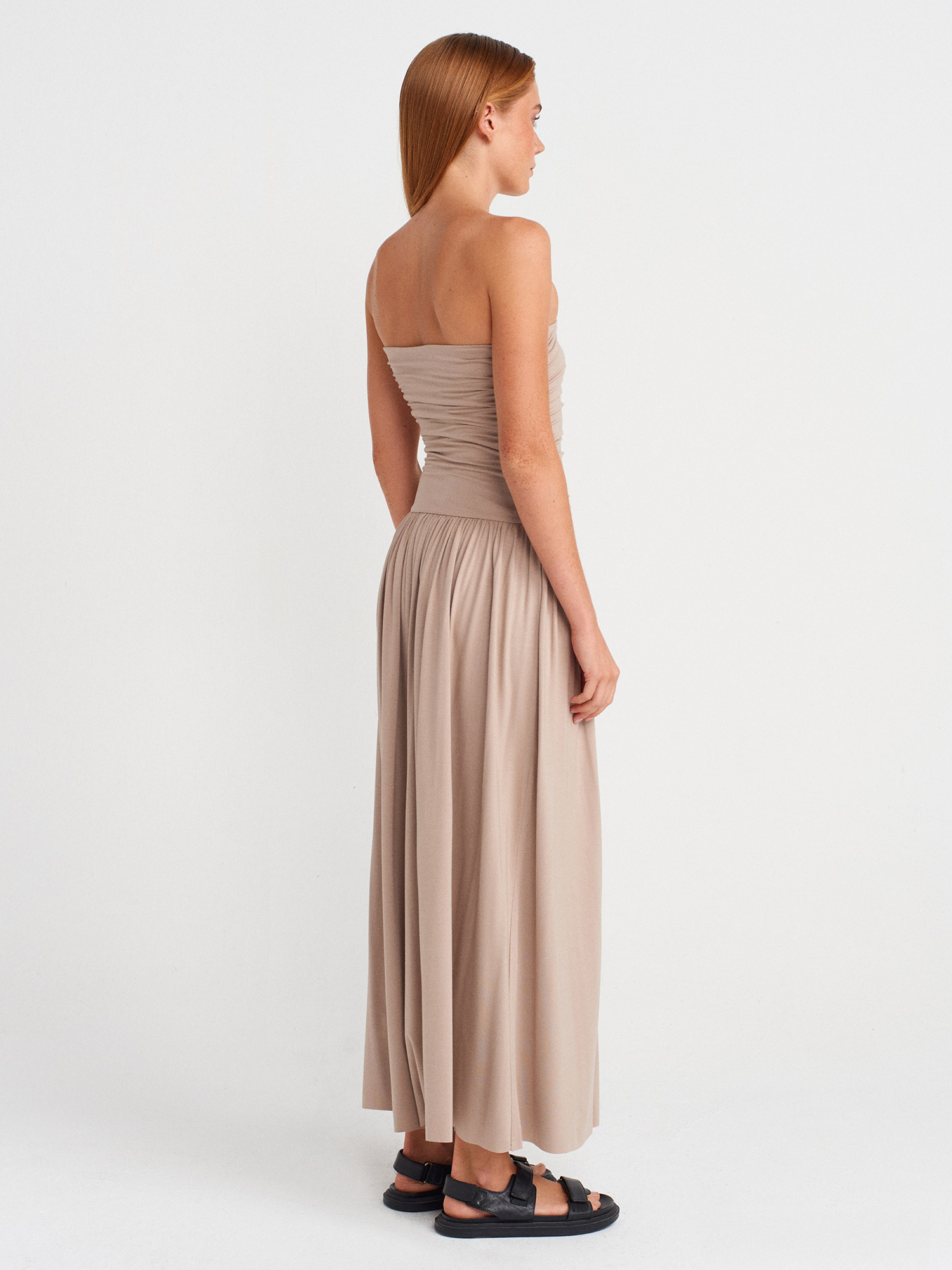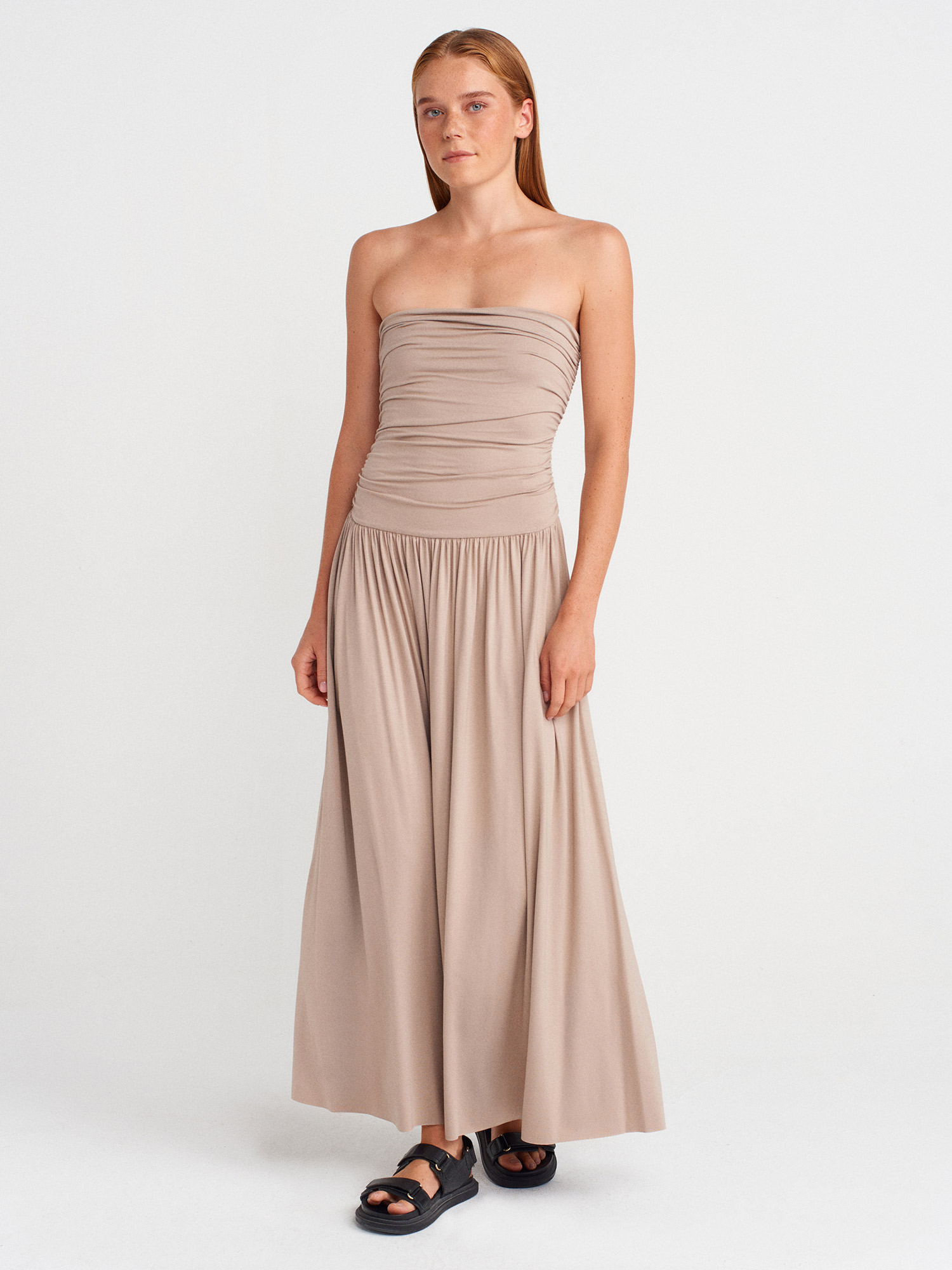 91496 Straplez Büzgülü Elbise-Koyu Taş